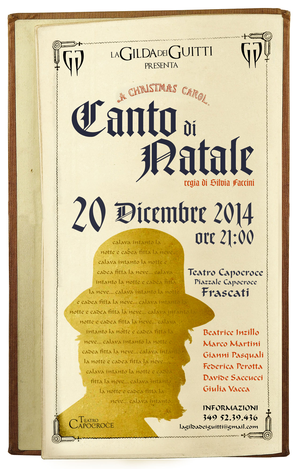 La Gilda dei Guitti è lieta di presentare Canto di Natale (A Christmas Carol) di C. Dickens, regia di Silvia Faccini con Silvia Faccini, Beatrice Inzillo, Marco Martini, Gianni Pasquali, Federica Perotta, Davide Saccucci e Giulia Vacca.